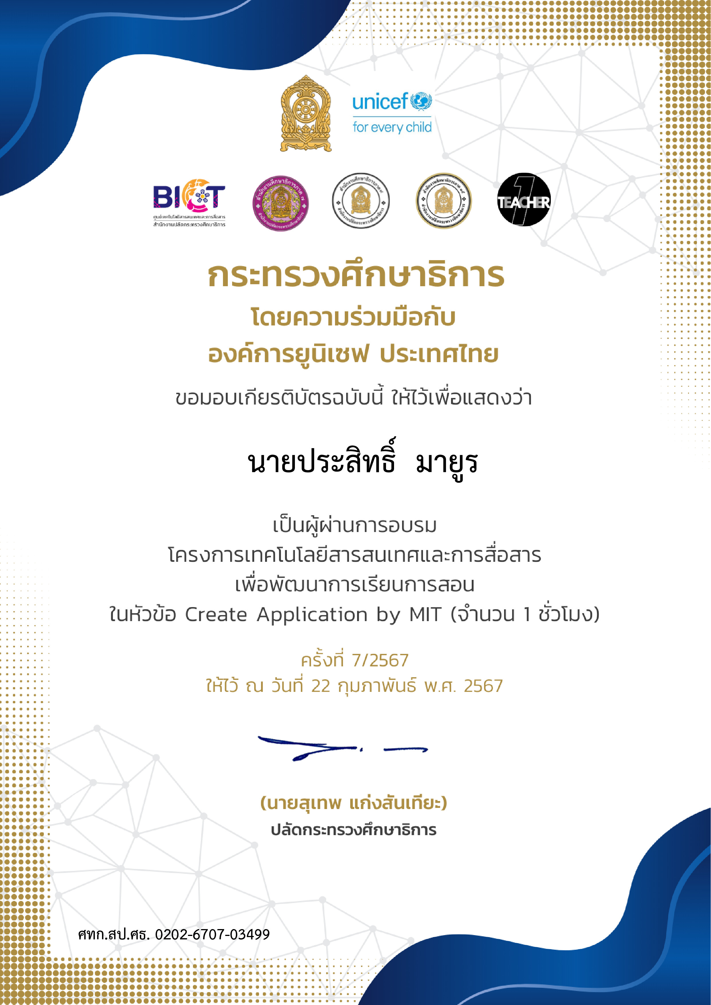 1. นายประสิทธิ์ มายูร ผ่านการอบรมโครงการเทคโนโลยีสารสนเทศและการสื่อสารเพื่อพัฒนาการเรียนการสอน หัวข้อ Create Application by MIT (จำนวน 1 ชั่วโมง)