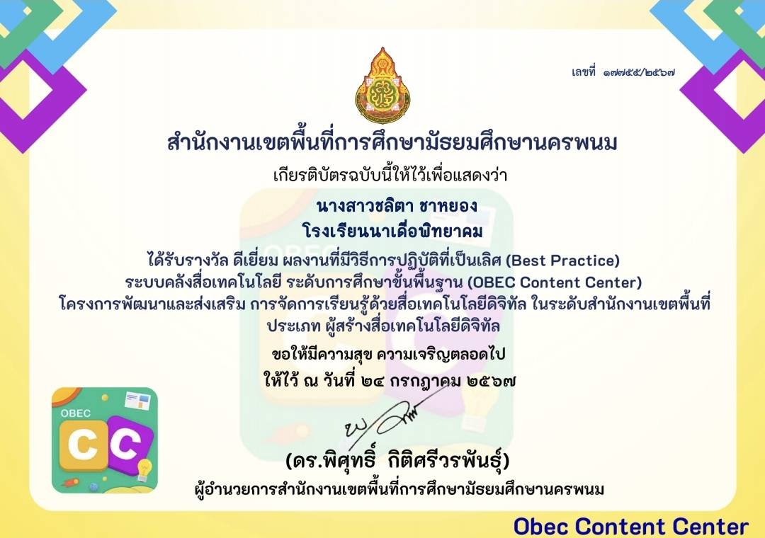 นางสาวชลิตา ชาหยอง ได้รับรางวัล ดี่เยี่ยม ผลงานที่มีการปฏิบัติที่เป็นเลิศ (ฺBest Practice)