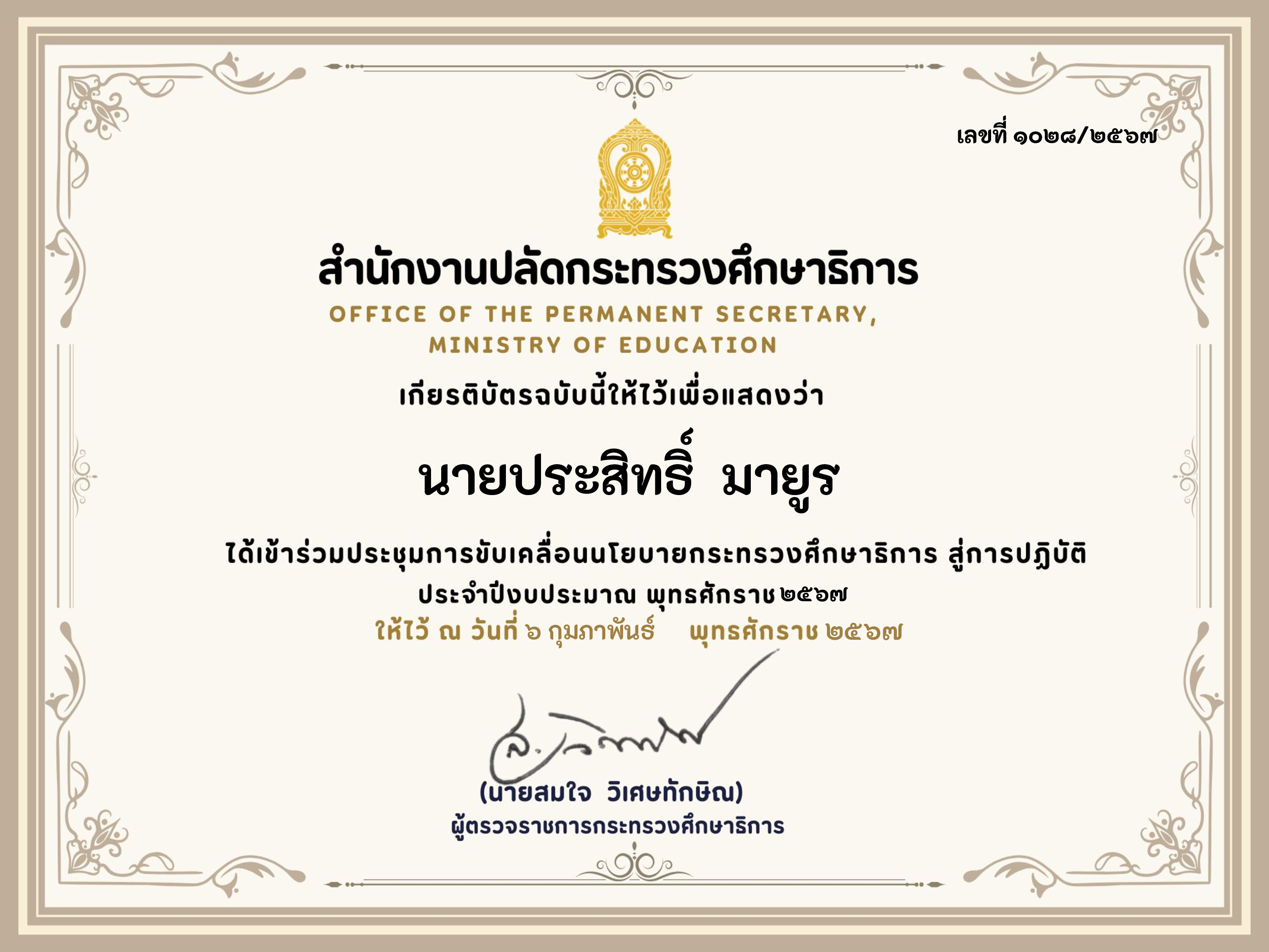 นายประสิทธิ์ มายูร เข้าร่วมประชุมขับเคลื่อนนโยบายกระทรวงศึกษาธิการสู่การปฏิบัติ ประจำปีงบประมาณ พุทธศักราช 2567 สำนักงานปลัดกระทรวงศึกษาธิการ
